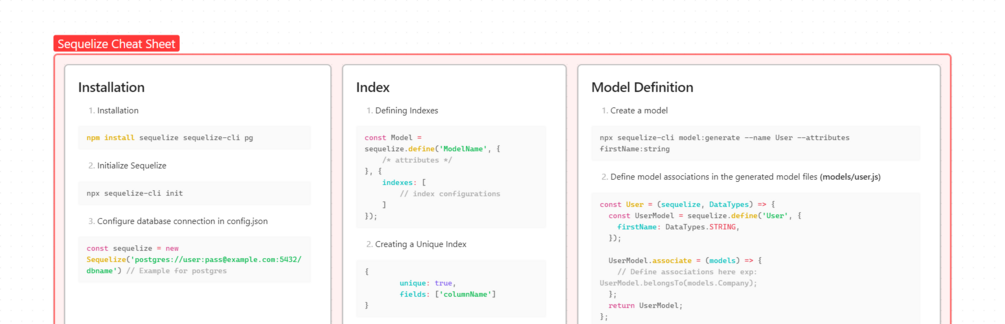 With this cheat sheet, you can quickly access Sequelize definitions and commands.